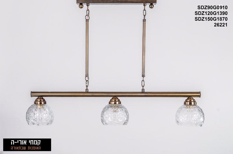 מנורת IMG 2575 בעלת בסיס מלבני, 2 זרועות ומוט רוחבי בצבע פליז. על המוט צלחות זכוכית עגולים בעבודת יד.