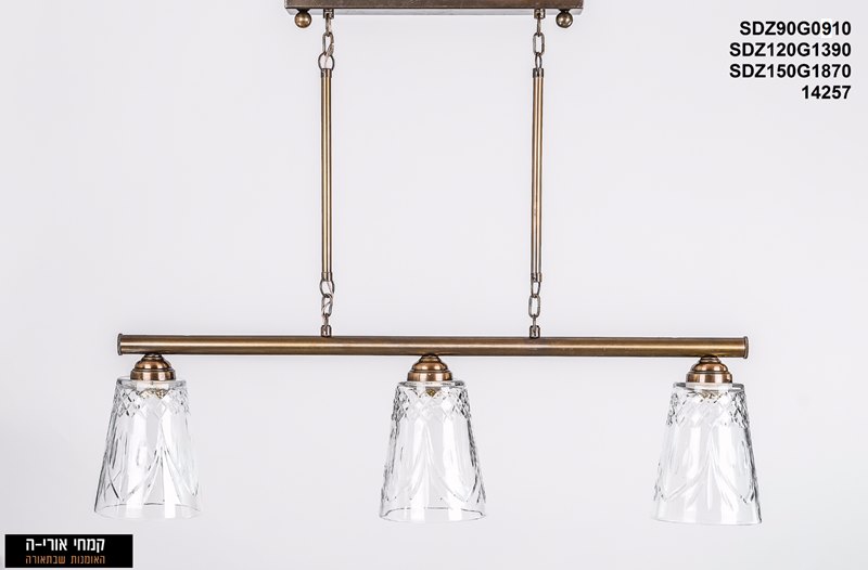 מנורת IMG 2578 בעלת בסיס מלבני, 2 זרועות ומוט רוחבי בצבע פליז. על המוט צלחות זכוכית עגולים בעבודת יד.