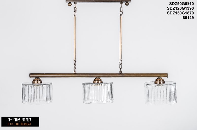 מנורת IMG 2585 בעלת בסיס מלבני, 2 זרועות ומוט רוחבי בצבע פליז. על המוט צלחות זכוכית עגולים בעבודת יד.