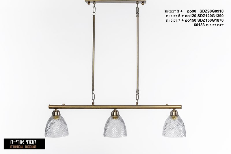 מנורת SDZ90G50133 בעלת בסיס מלבני, 2 זרועות ומוט רוחבי בצבע פליז. על המוט צלחות זכוכית עגולים בעבודת יד.
