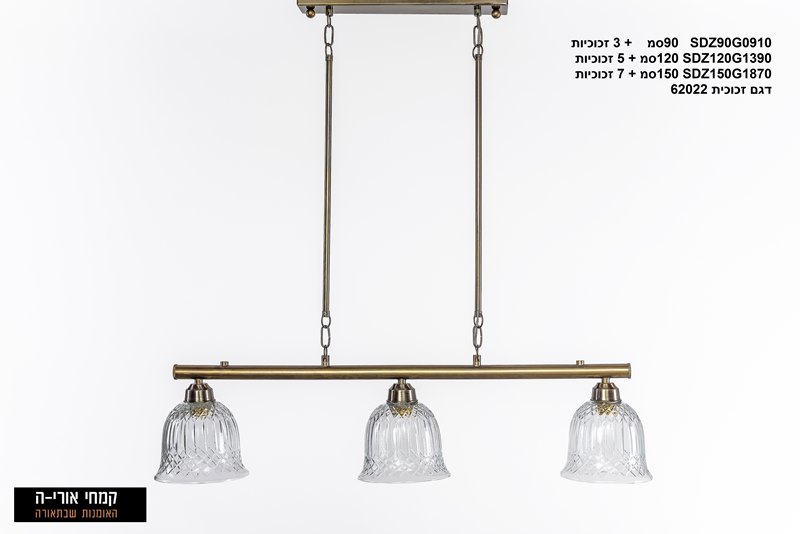 מנורת SDZ90G62022 בעלת בסיס מלבני, 2 זרועות ומוט רוחבי בצבע פליז. על המוט צלחות זכוכית עגולים בעבודת יד.