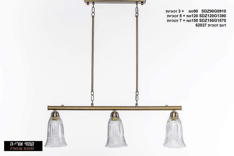 מנורת SDZ90G62037 בעלת בסיס מלבני, 2 זרועות ומוט רוחבי בצבע פליז. על המוט צלחות זכוכית עגולים בעבודת יד.