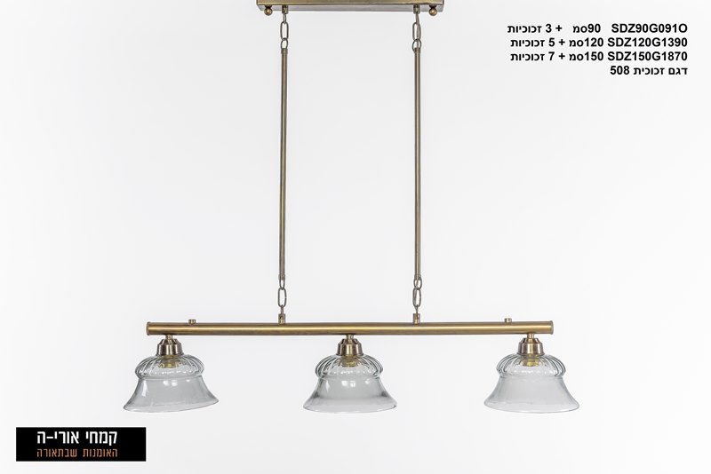מנורת SDZ90G151508 בעלת בסיס מלבני, 2 זרועות ומוט רוחבי בצבע פליז. על המוט צלחות זכוכית עגולים בעבודת יד.